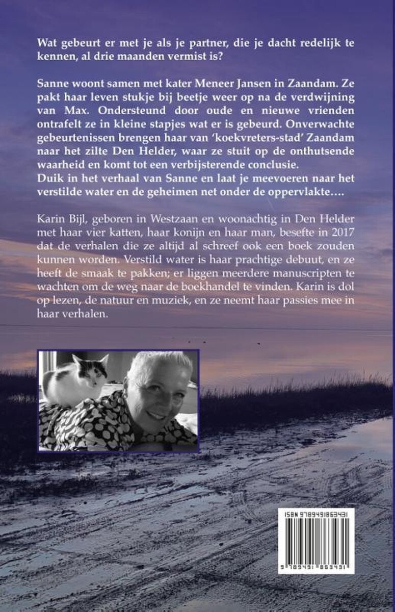Wat gebeurt er met je als je partner, die je dacht redelijk te kennen, al drie maanden vermist is? Sanne woont samen met kater Meneer Jansen in Zaandam. Ze pakt haar leven stukje bij beetje weer op na de verdwijning van Max. Ondersteund door oude en nieuwe vrienden ontrafelt ze in kleine stapjes wat er is gebeurd. Onverwachte gebeurtenissen brengen haar van ‘koekvreters-stad’ Zaandam naar het zilte Den Helder, waar ze stuit op de onthutsende waarheid en komt tot een verbijsterende conclusie. Duik in het verhaal van Sanne en laat je meevoeren naar het verstilde water en de geheimen net onder de oppervlakte…